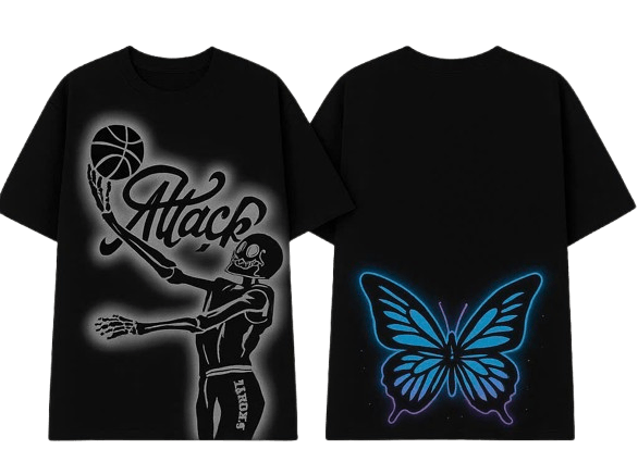 Áo thun đen phá cách với hình in bộ xương chơi bóng rổ và chữ “Attack” đậm chất thể thao đường phố ở mặt trước. Mặt sau tạo điểm nhấn bằng hình cánh bướm phát sáng phong cách neon ảo diệu, mang thông điệp ẩn về sự tự do và chuyển hóa. Phối hợp giữa mạnh mẽ và mềm mại, lý tưởng cho giới trẻ yêu phong cách edgy cá tính.