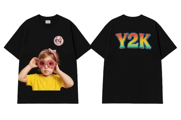 Chiếc áo thun đen nổi bật với hình in bé gái đeo kính hoa dễ thương ở mặt trước, kết hợp cùng logo vintage và dòng chữ “Y2K” rực rỡ phong cách retro ở mặt sau. Phù hợp cho những ai yêu thích phong cách hoài cổ pha chút cá tính và đáng yêu.
